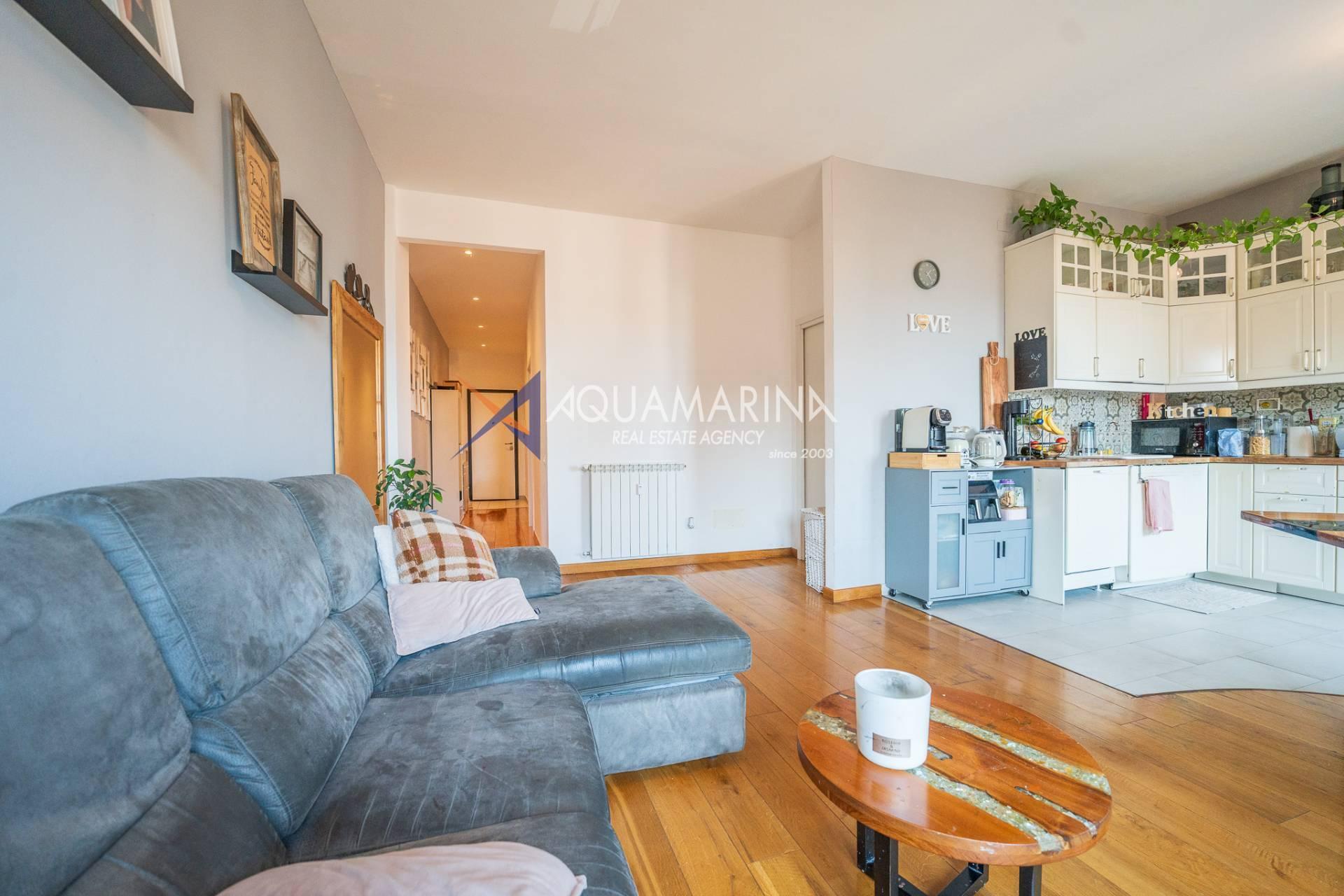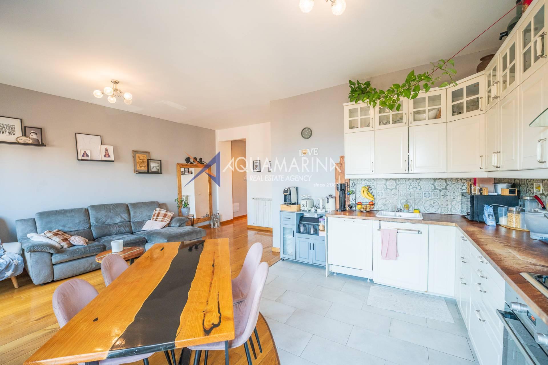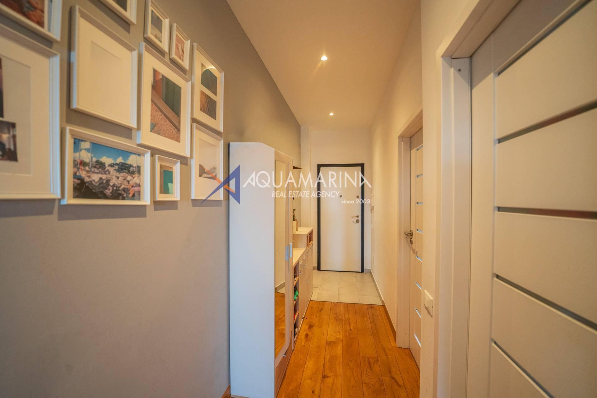 Из квартиры можно попасть в прихожую, которая ведет в гостиную, состоящую из светлой гостиной и кухни открытой планировки — уютного и хорошо организованного пространства. Отсюда можно выйти на большой балкон с приятным видом на море, идеально подходящий для отдыха.