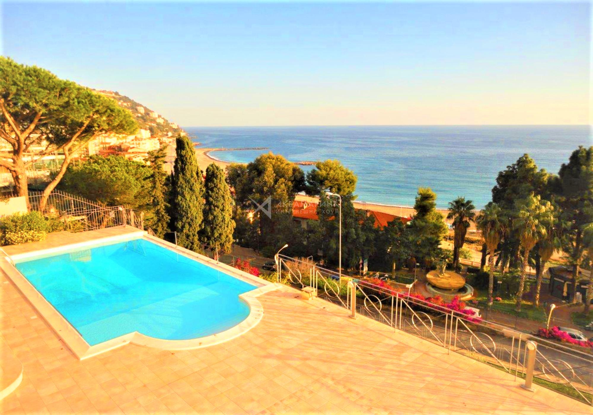 Просторный частный сад площадью около 1500 м2, большой пейзажный бассейн с великолепным видом на море.
