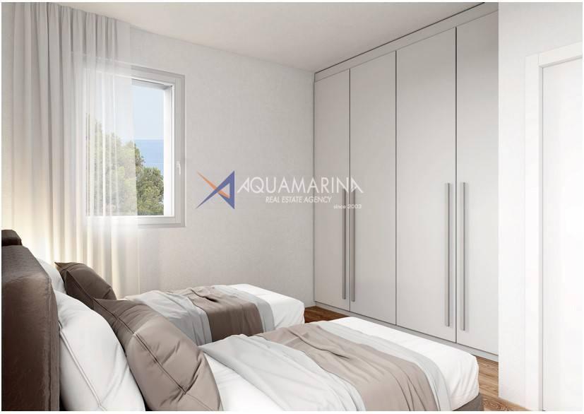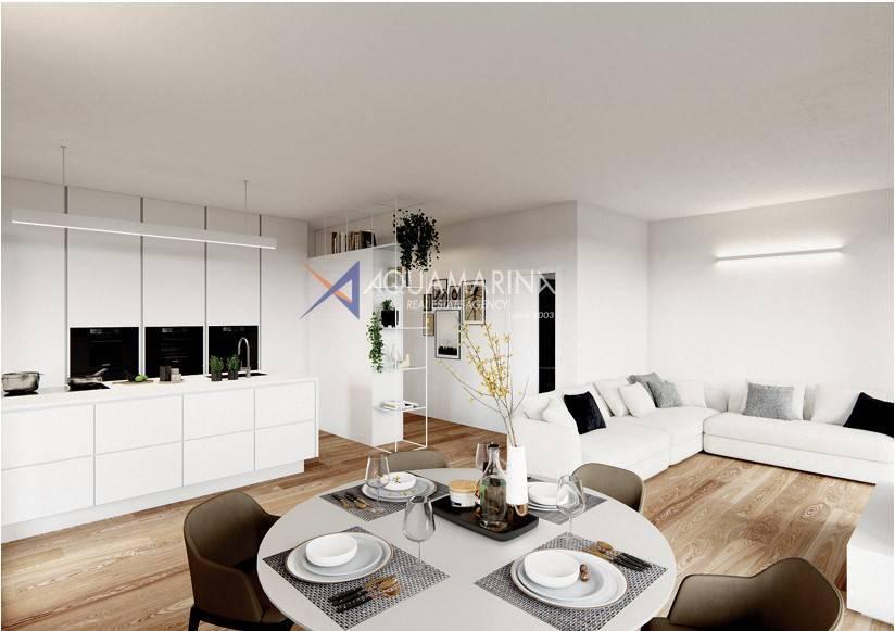 Как указано на планах, квартира может быть разделена на три или четыре комнаты в зависимости от пожеланий покупателя. В случае выбора планировки с тремя комнатами она будет включать в себя просторную гостиную с кухонным уголком, две спальни с двуспальными кроватями, одна из которых с выходом на террасу, и две ванные комнаты.