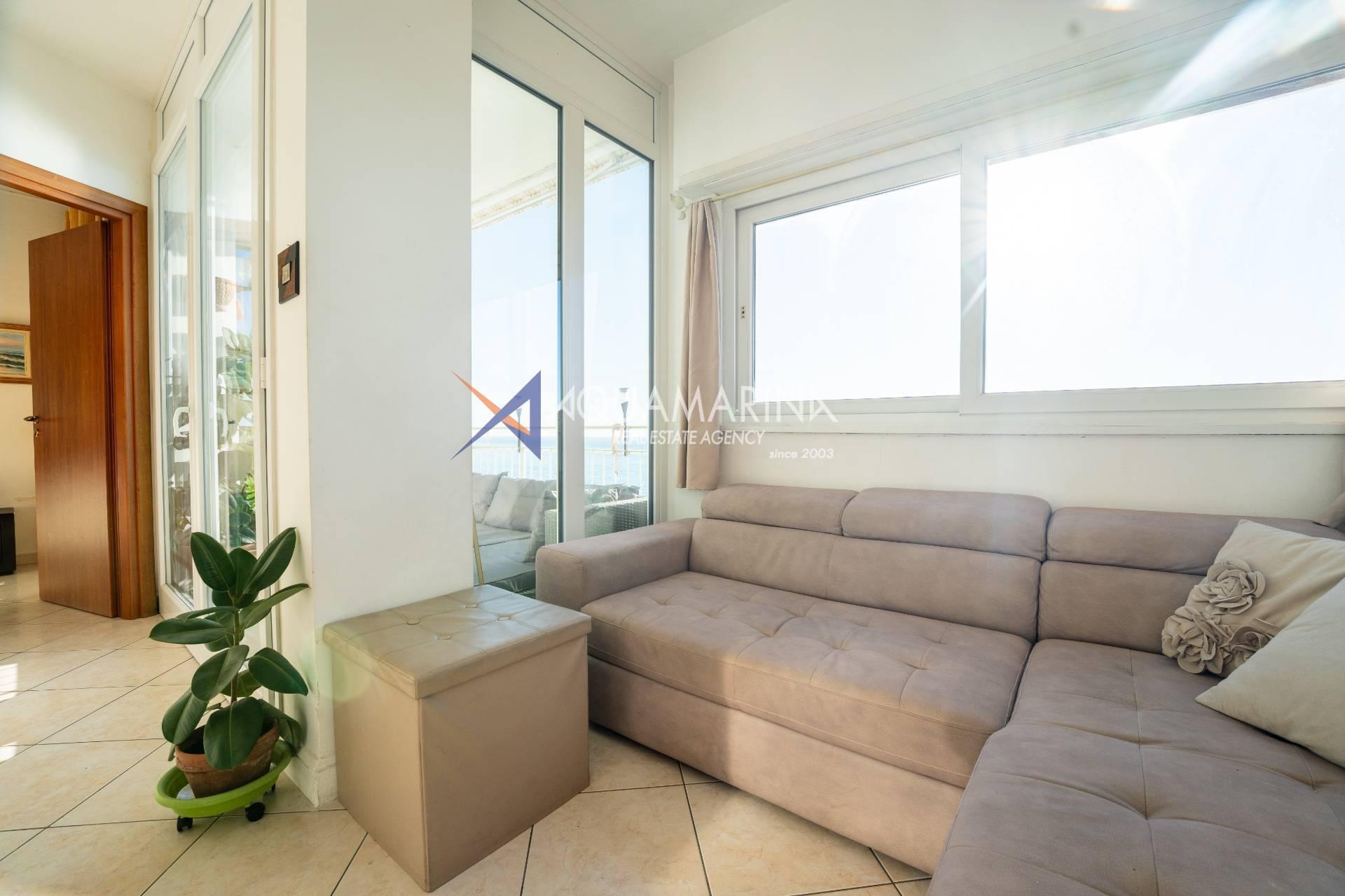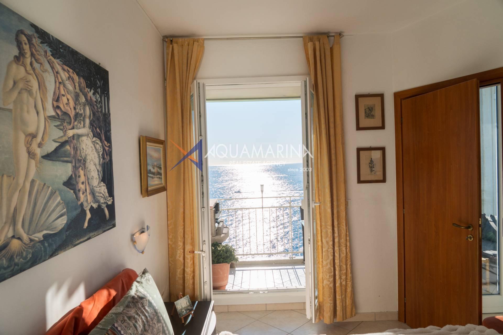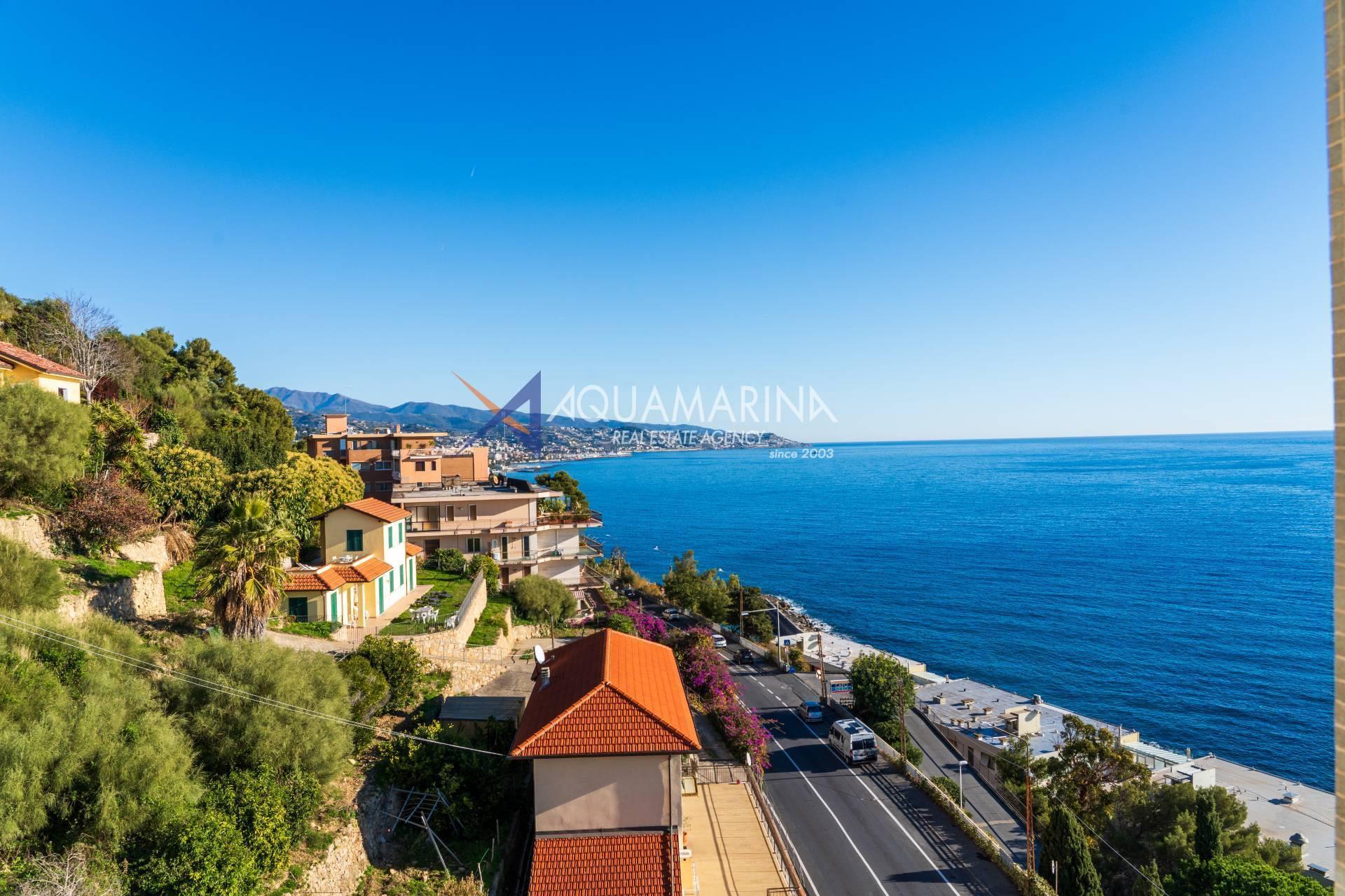 Сан-Ремо, квартира с видом на море. Продаётся квартира на 5 этаже с лифтом, практически на первой линии моря, с захватывающим дух видом. Из квартиры открывается панорамный вид на Капо-Неро, одно из самых живописных мест Ривьеры-ди-Поненте. Благодаря удачному расположению и большим окнам, квартира залита естественным светом, а большая терраса позволяет наслаждаться бесценным видом, одновременно расслабляясь в полном спокойствии, практически посреди моря. Квартира состоит из прихожей, кухни открытой планировки с кладовой и окном с видом на море, двойной гостиной с окном, выходящим на море, и выходом на террасу, двух спален с видом на море и выходом на террасу, ванной комнаты с окном, второго туалета, большой террасы, балкона и подвала. Отопление автономное, с подвесным камином и тепловым насосом, который обогревает и охлаждает квартиру. Внешние окна изготовлены из ПВХ с двойным остеклением.