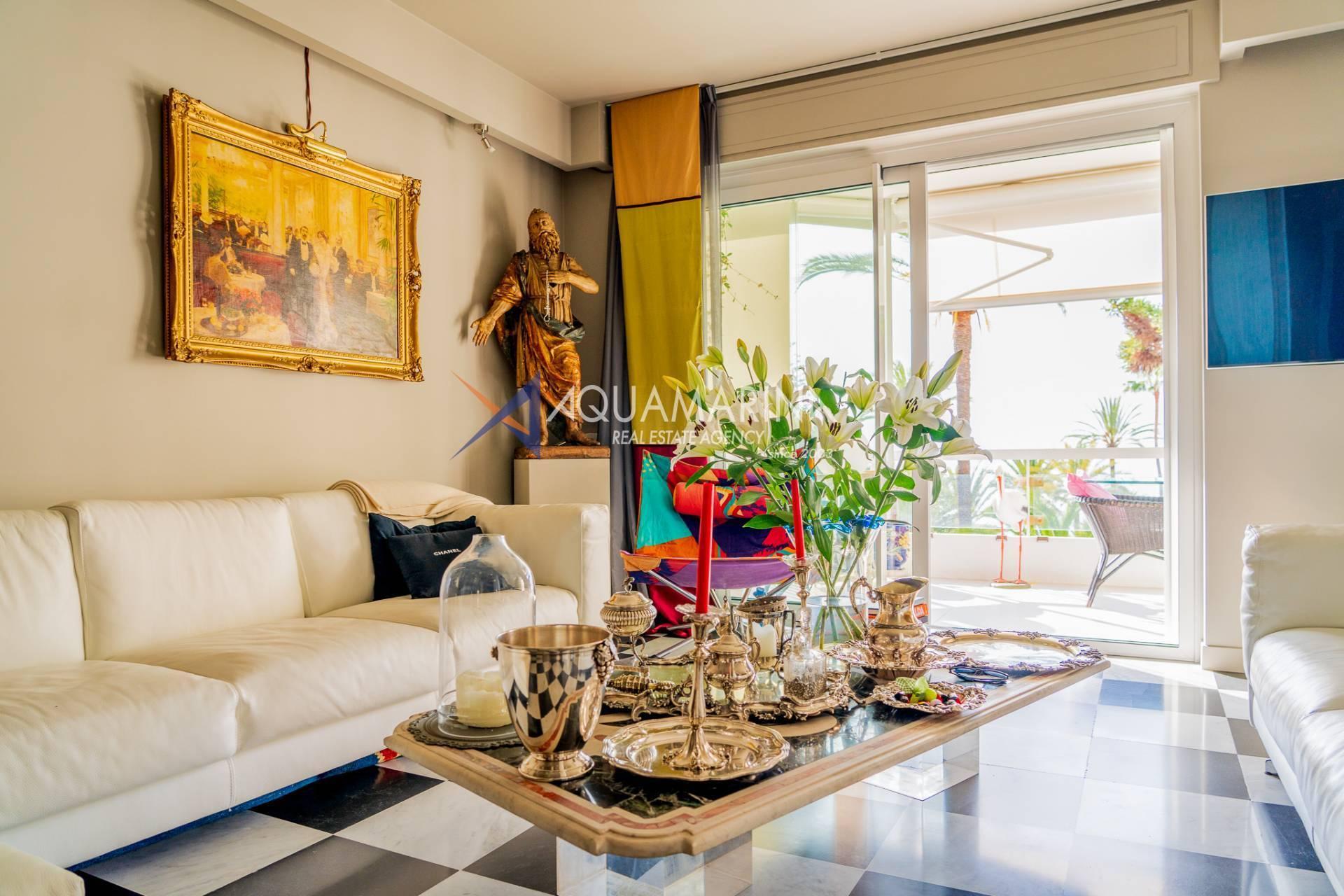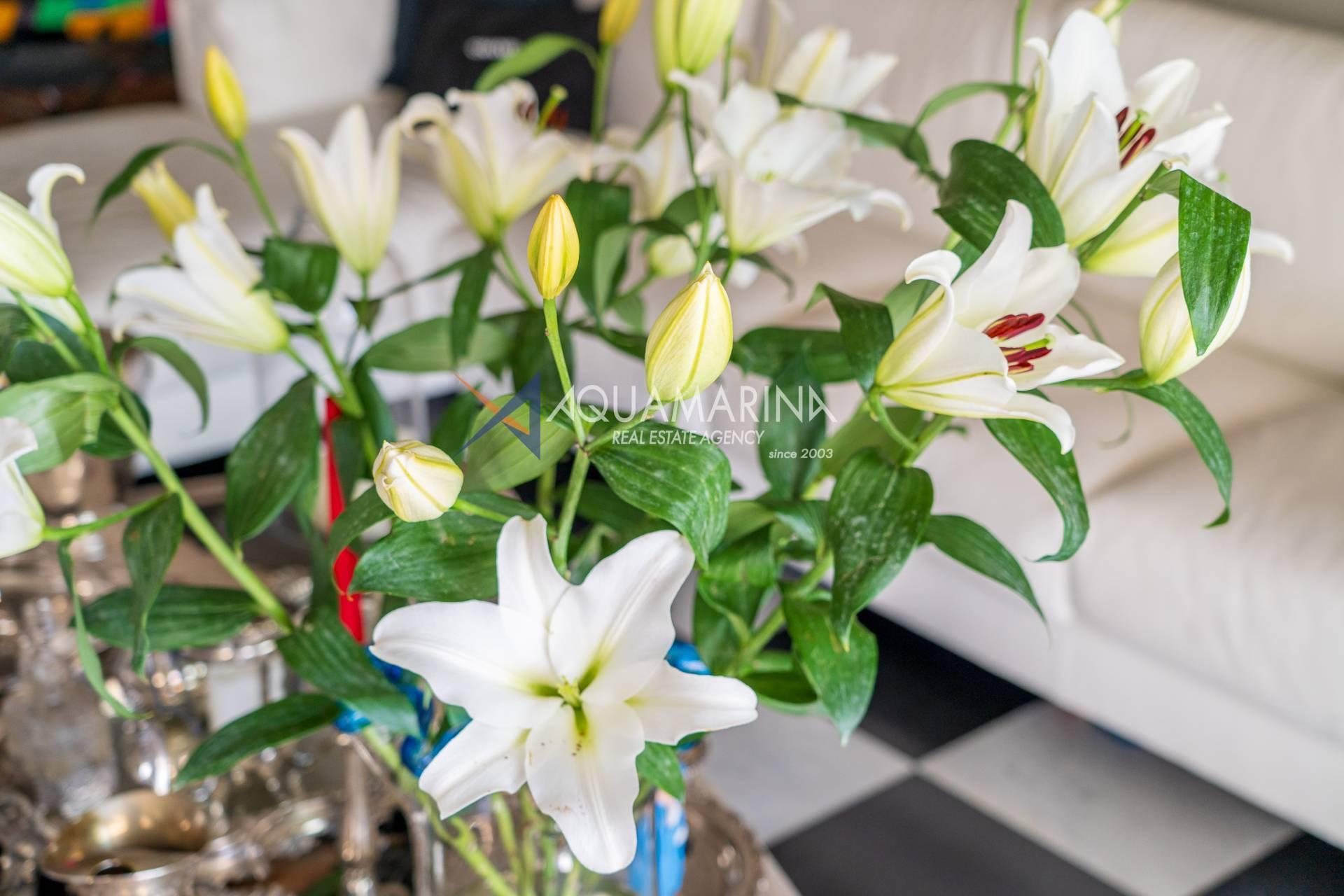 Жилье, полностью отремонтированное и оформленное со вкусом, распределяется следующим образом: вход в просторную гостиную с выходом на террасу с видом на море, столовая с оборудованной кухней и выходом на вторую террасу, две спальни и две просторные ванные комнаты.